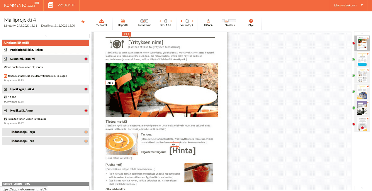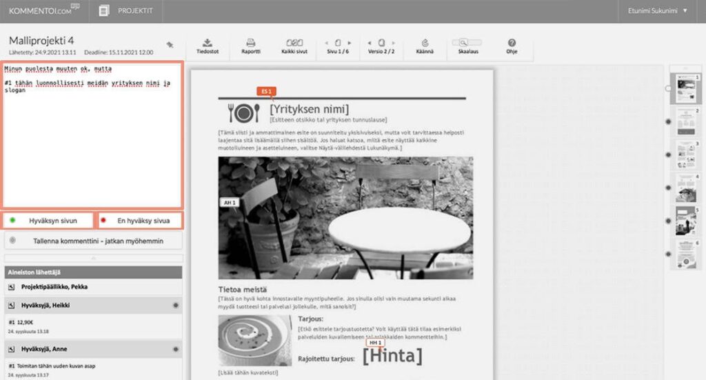 Kommentoi.com on dokumenttien kommentointiprosessia tehostava web-palvelu, jossa voi nopeasti tarkastaa projektien tilanteen, tehdä korjausmerkintöjä ja hyväksyä materiaaleja.