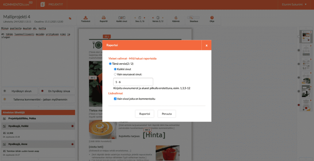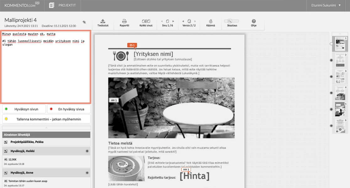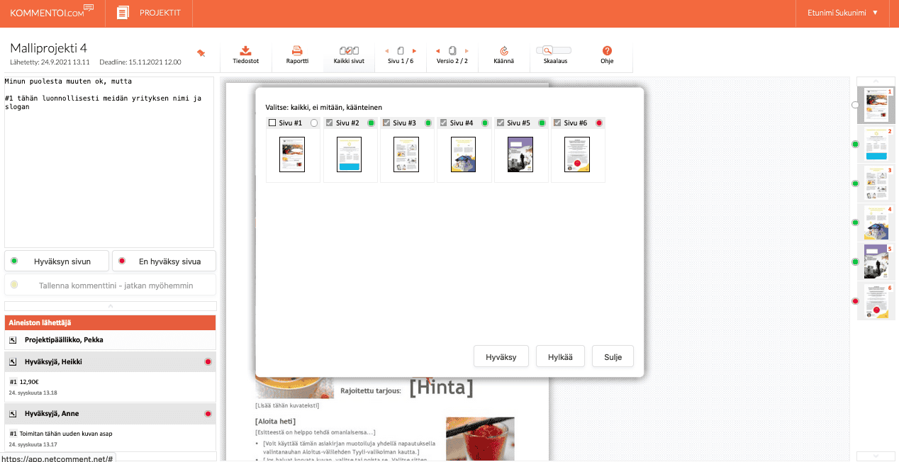 Huomioithan, että sujuvan työnkulun vuoksi on suositeltavaa, että hyväksyt myös sellaiset projektin sivut, jotka eivät välttämättä ole sinun vastuulla, jotta projektit eivät jää kesken. Voit hyväksyä useamman sivun yhdellä kertaa kommentointinäkymän ylävalikon kohdasta ”Kaikki sivut”.