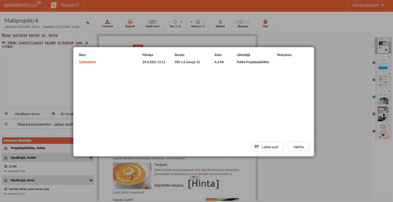 Täältä voit ladata itsellesi alkuperäisen kommentoitavan tiedoston ja mahdolliset muut projektiin työryhmän toimesta ladatut liitetiedostot. Voit myös lisätä projektiin itse liitetiedostoja, kuten esimerkiksi puuttuvia kuvia, isompia tekstidokumentteja jne. Sama toiminto löytyy myös kommentointinäkymästä.