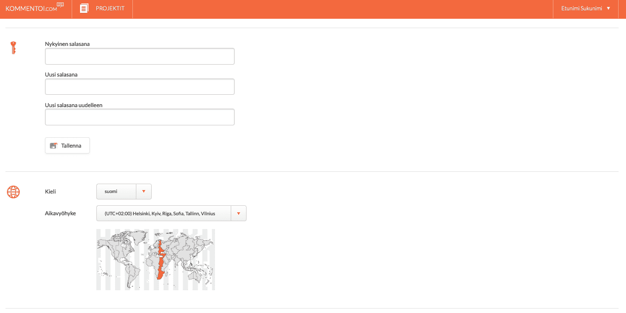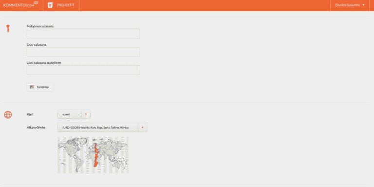 Oma sivu -osioon pääset palvelun oikean yläkulman alasvetovalikosta. Siellä voit mm. vaihtaa tilisi salasanan ja määritellä millaisia viestejä haluat saada projekteista ja kommentoinnin etenemisestä.