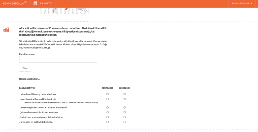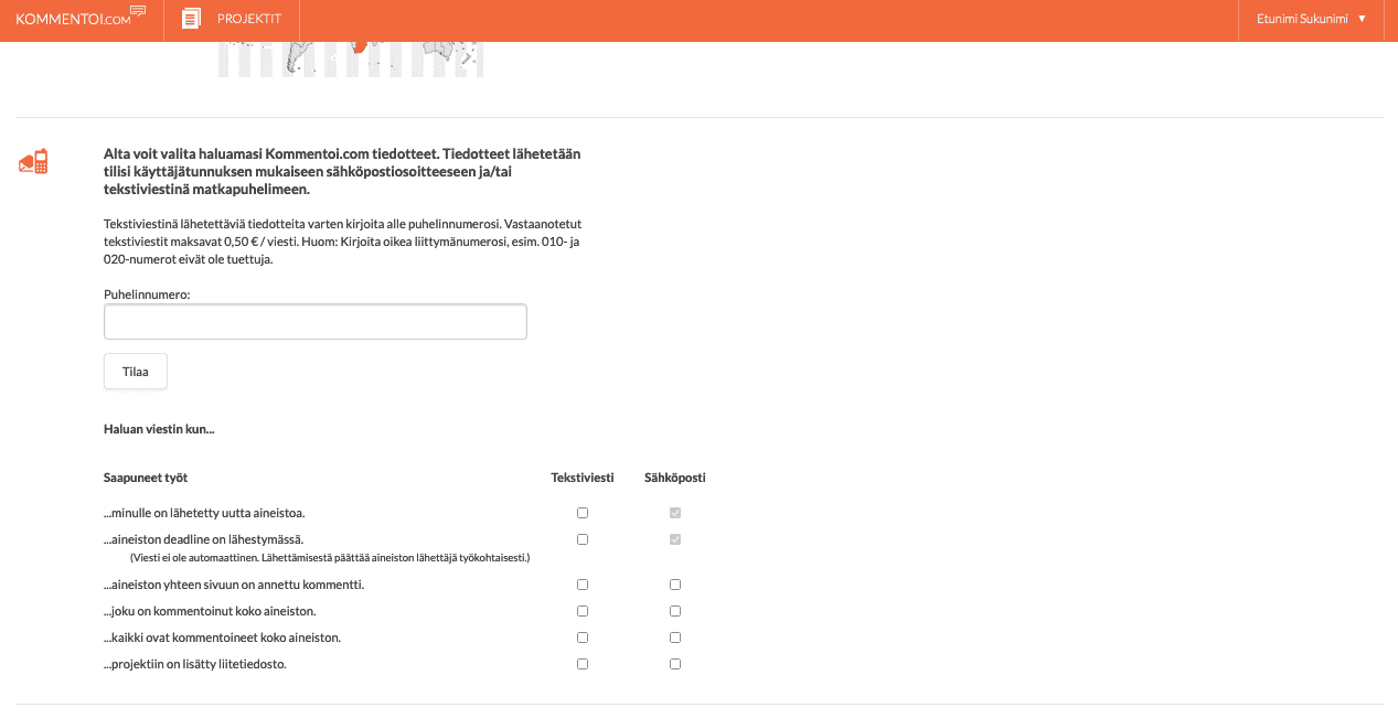 Automaattisten viestien lisäksi voit valita itsellesi viestejä projektien kommentoinnin etenemisestä. Kaikki viestit voit valita myös tekstiviesteinä (tekstiviestit toimivat vain suomalaisissa liittymissä, joissa maksullisia viestejä ei ole erikseen estetty).