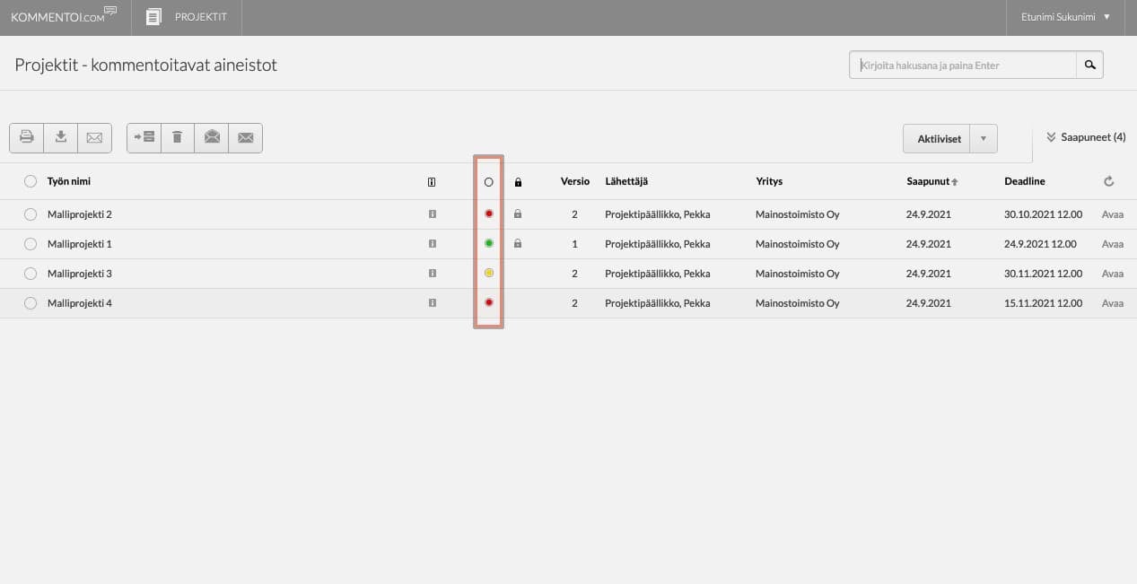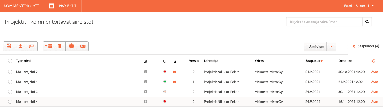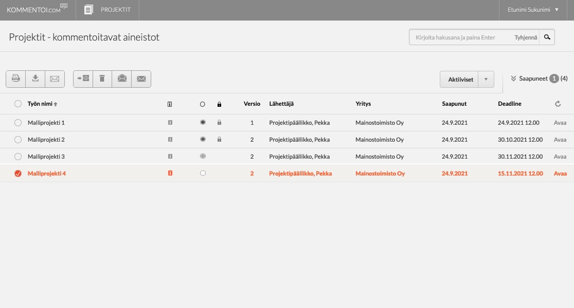 Projektiriviltä näet lisäksi kaikki projektin perustiedot, kuten versioiden määrän, milloin projekti on saapunut ja mikä on projektin kommentoinnin deadline. Projektit voit järjestää aika- ja aakkojärjestykseen kaikkien saraketietojen mukaan klikkaamalla sarakkeen otsikoita.