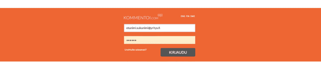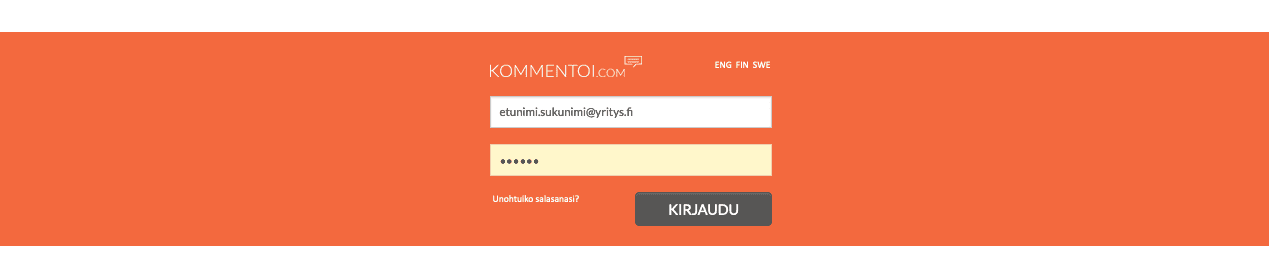 Palvelun käyttäjätunnus on aina oma sähköpostiosoitteesi (sama osoite, johon myös projektisähköposti on sinulle saapunut). Salasana on toimitettu sinulle etukäteen sähköpostilla. Mikäli et löydä salasana sähköpostia tai et muista salasanaasi, voit helposti tilata uuden salasanan sisäänkirjautumissivun ”Unohdin salasanani” linkistä.